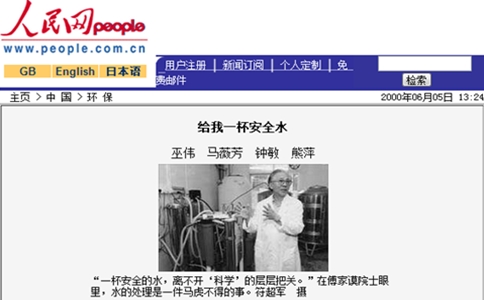 2000年6月5日,人民網(wǎng)發(fā)表了一篇《南方日報》對水杯子名譽董事長傅家謨院士的采訪報道,講述了將飲水與用水分開,采用深度處理技術(shù)提高飲水品質(zhì),解決飲水污染問題。